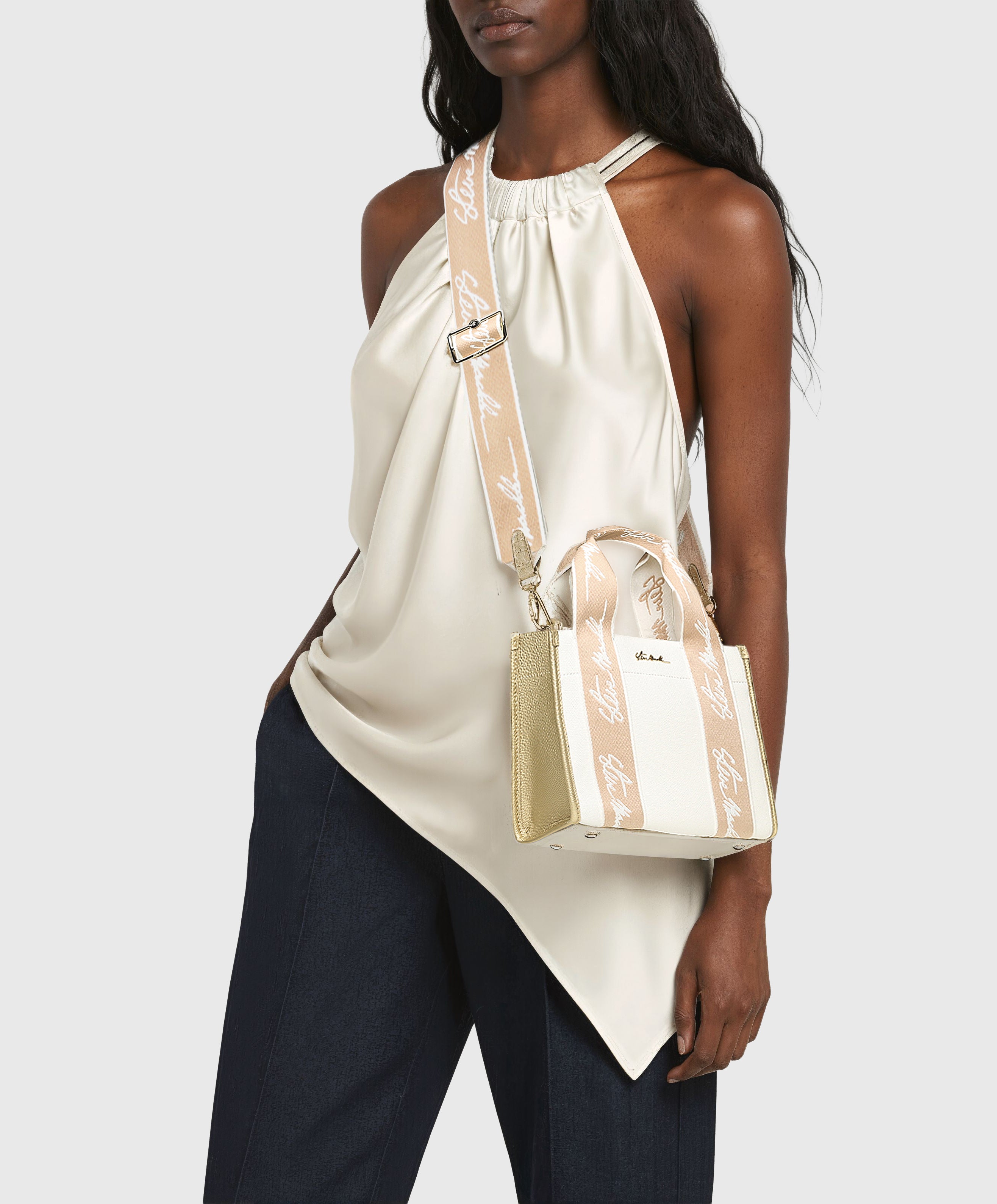 Esta mini tote lleva la energía de un ícono en versión compacta. Su estructura firme y pequeña la hace ver chic sin esfuerzo, mientras que el diseño es la mezcla perfecta entre un look pulido y uno más relajado. Las asas cortas le dan un aire elegante, y la correa larga con tipografía especial aporta ese toque distintivo que la vuelve irresistible. Es la compañera ideal para elevar cualquier outfit sin perder comodidad ni estilo.